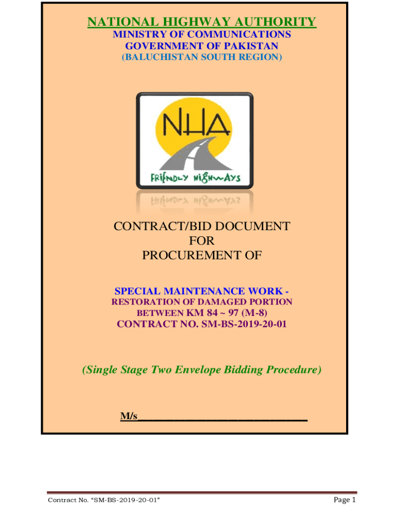 NATIONAL HIGHWAY AUTHORITY MINISTRY OF COMMUNICATIONS GOVERNMENT OF PAKISTAN (BALUCHISTAN SOUTH REGION)CONTRACT/BID DOCUMENT FOR PROCUREMENT OF SPECIAL MAINTENANCE WORK RESTORATION OF DAMAGED PORTION