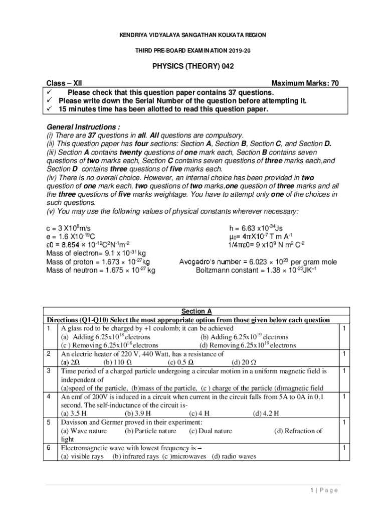 THIRD PREBOARD EXAMINATION 201920PHYSICS (THEORY) 042