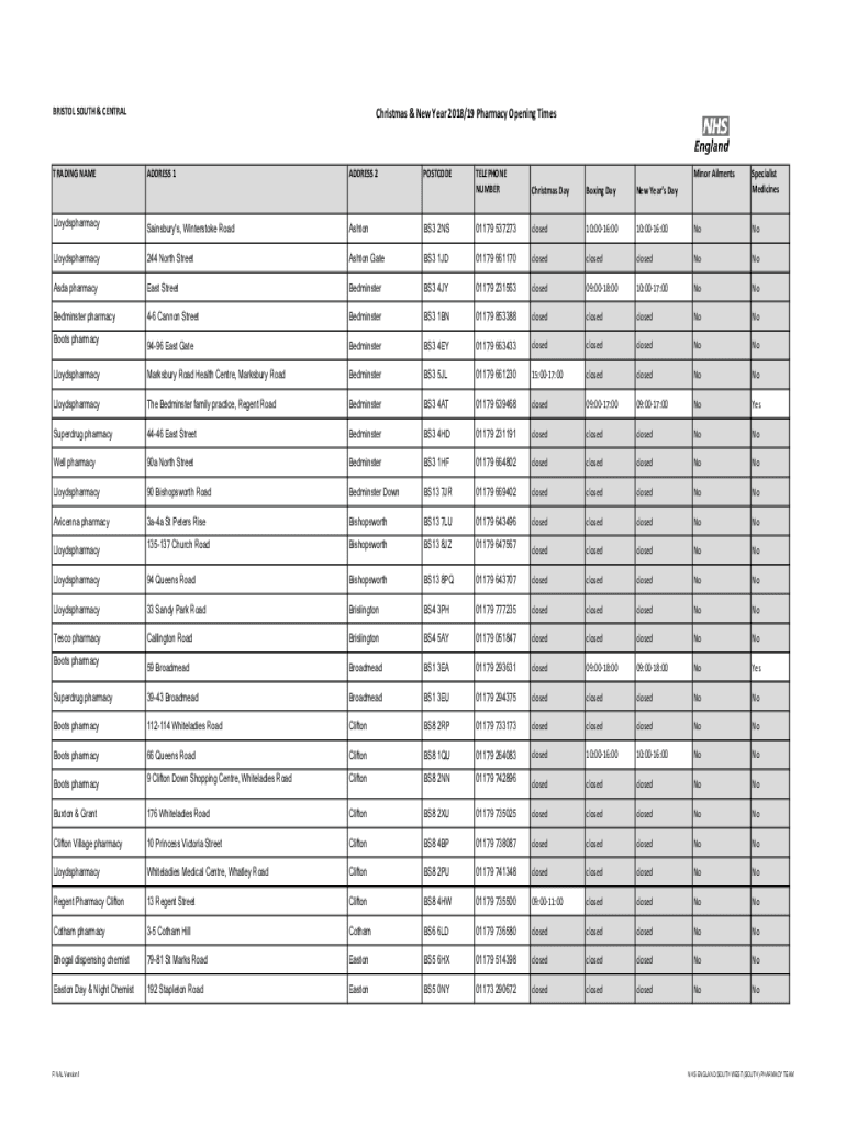 BRISTOL SOUTH & CENTRALTRADING NAMELloydspharmacyChristmas & New Year 2018/19 Pharmacy Opening Misaddress 1ADDRESS 2POSTCODETELEPHONE
