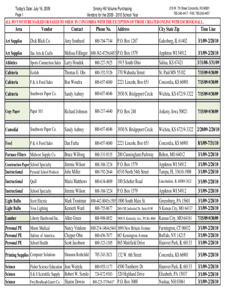 219 W. 7th Street Concordia, KS 66901 Smoky Hill Volume Purchasing 7852434417 FAX: 7852434457-Page 1 Vendors for the 2009 2010 School Year ALL PO\'S MUST BE MAILED OR FAXED TO SHE'S IN CONCORDIA Except