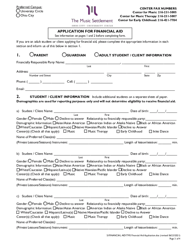 FINANCIAL AID INFORMATION SHEET PLEASE READ CAREFULLY WHO CAN APPLY FOR FINANCIAL AID? Any student or client attending The Music Settlement on a regular basis may apply for aid. Students or clients