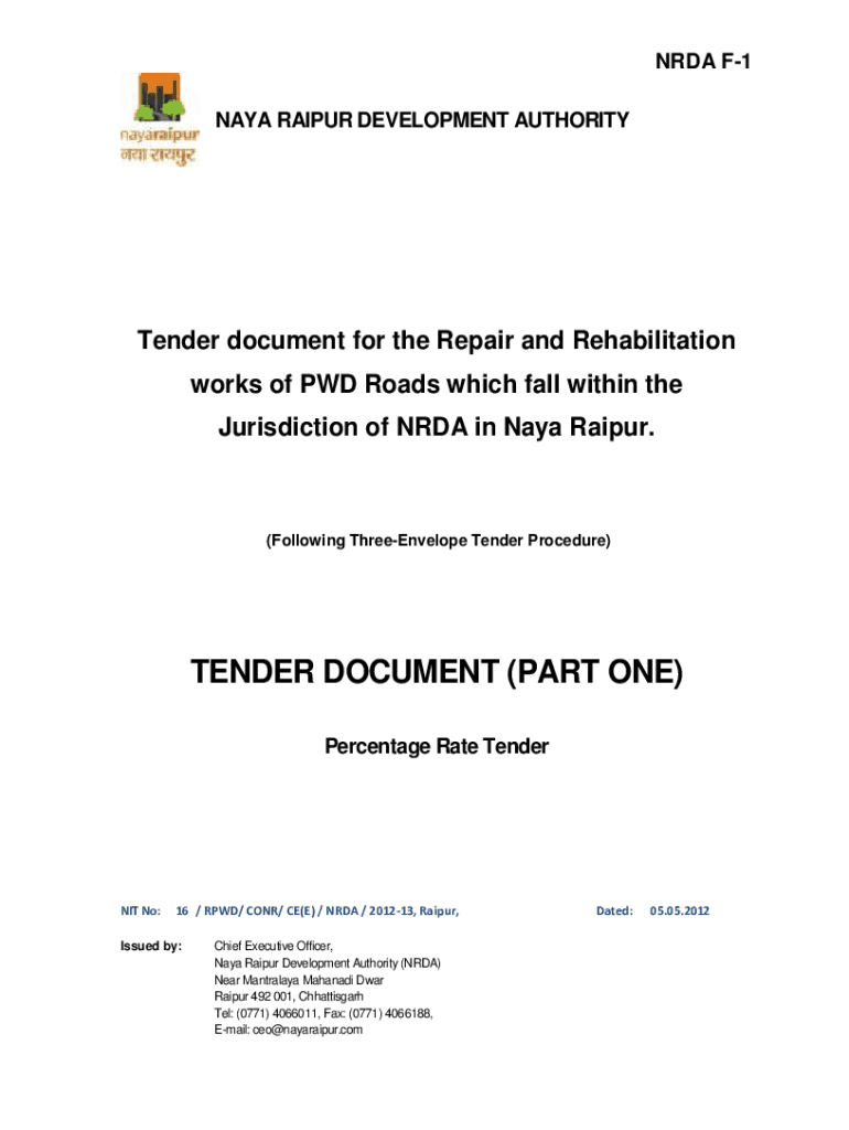 NRA F1 NAYA RAIPUR DEVELOPMENT AUTHORITYTender document for the Repair and Rehabilitation works of PhD Roads which fall within the Jurisdiction of NRA in Naya Raipur.(Following ThreeEnvelope Tender