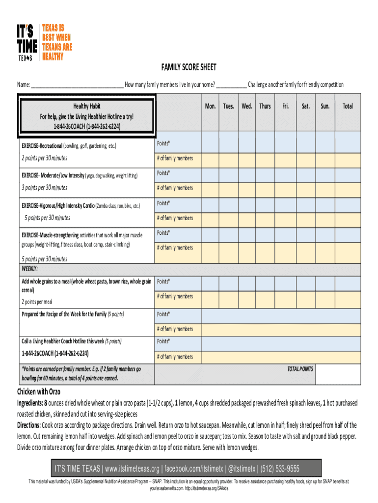 FAMILY Scoresheet Name: ___ How many family members live in your home? ___ Challenge another family for friendly competition Mon. Healthy Habit For help, give the Living Healthier Hotline a try! 184426COACH