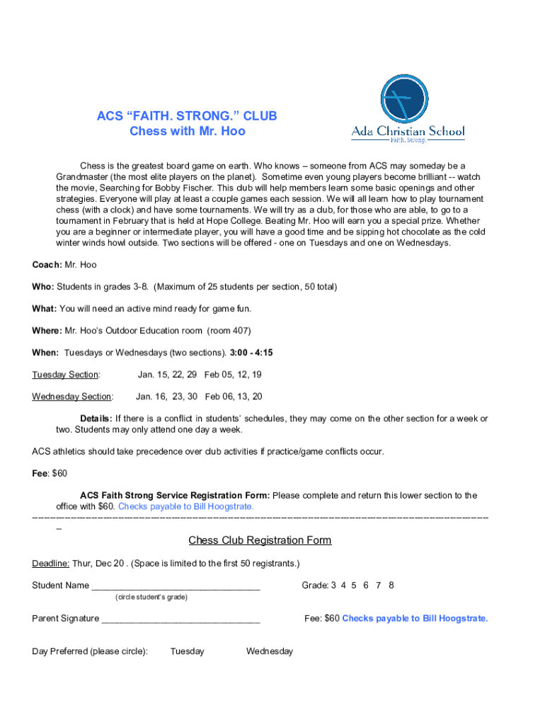 ACS FAITH. STRONG. CLUB Chess with Mr. Hui Chess is the greatest board game on earth. Who knows someone from ACS may someday be a Grand master (the most elite players on the planet). Sometime even