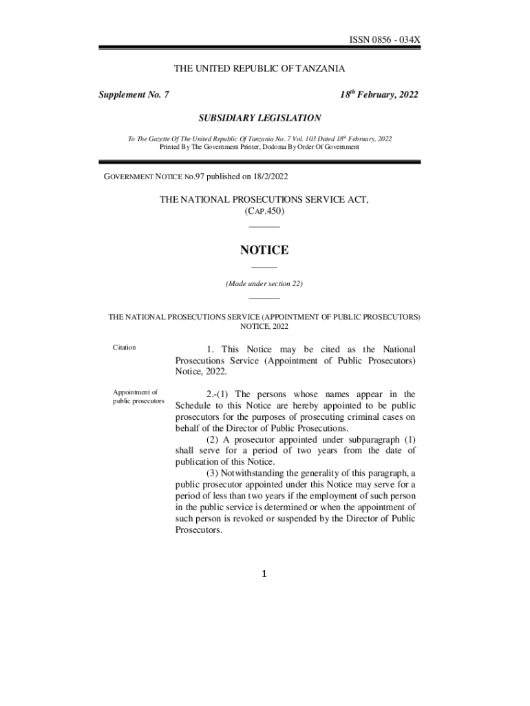 National Prosecutions Service (Appointment of Public Prosecutors) ISSN 0856 034X GN. No. 97 (Contd.)THE UNITED REPUBLIC OF TANZANIA 18th February, 2022Supplement No. 7 SUBSIDIARY Legislation The Gazette