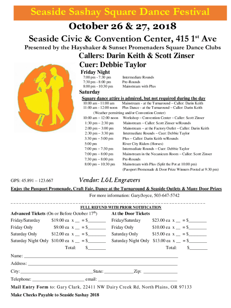 Seaside Sashay Square Dance Festival October 26 & 27, 2018 Seaside Civic & Convention Center, 415 1st Ave Presented by the Hay shaker & Sunset Promenades Square Dance ClubsCallers: Darin Keith & Scott
