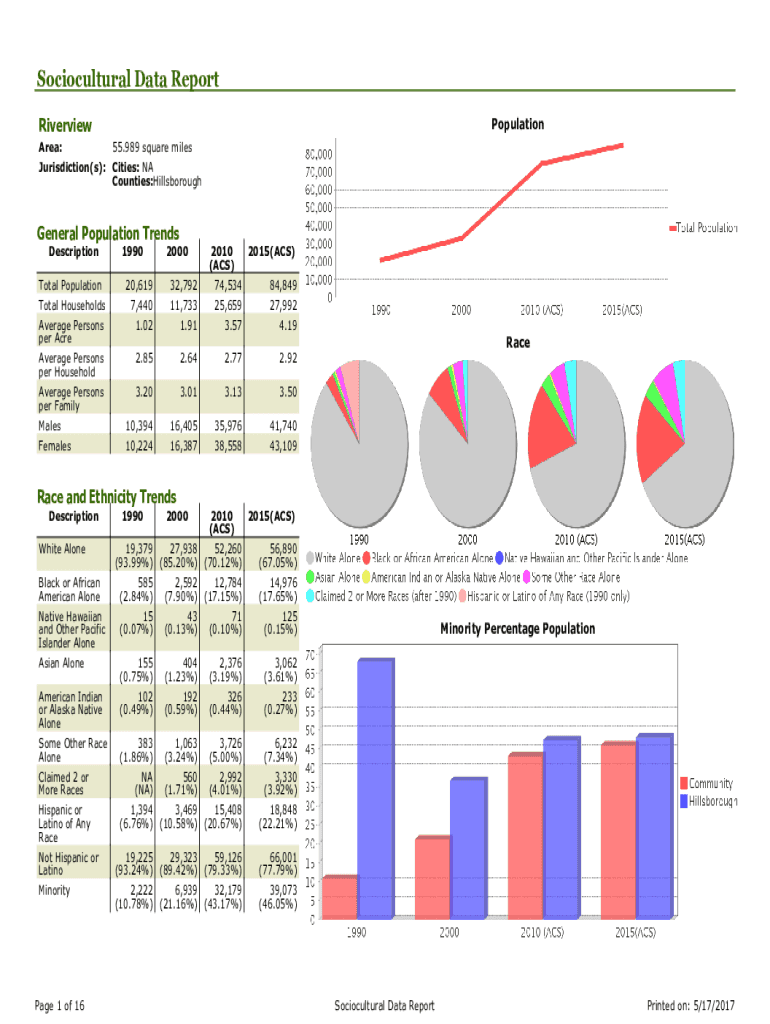 Sociocultural Data Report PopulationRiverview Area: 55.989 square miles Jurisdiction(s): Cities: NA Counties:HillsboroughGeneral Population Trends Description Total Population Total Households Average