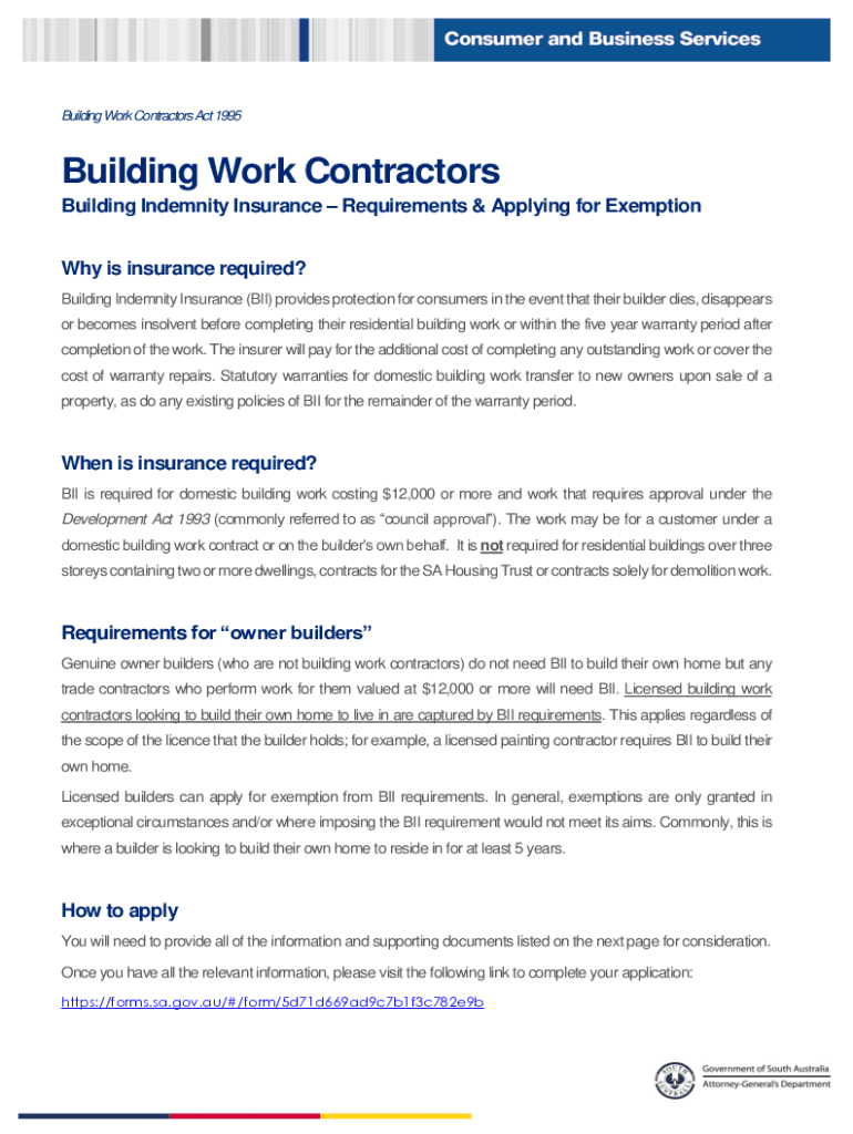 Building Work Contractors Act 1995Building Work Contractors Building Indemnity Insurance Requirements & Applying for Exemption Why is insurance required? Building Indemnity Insurance (BII) provides