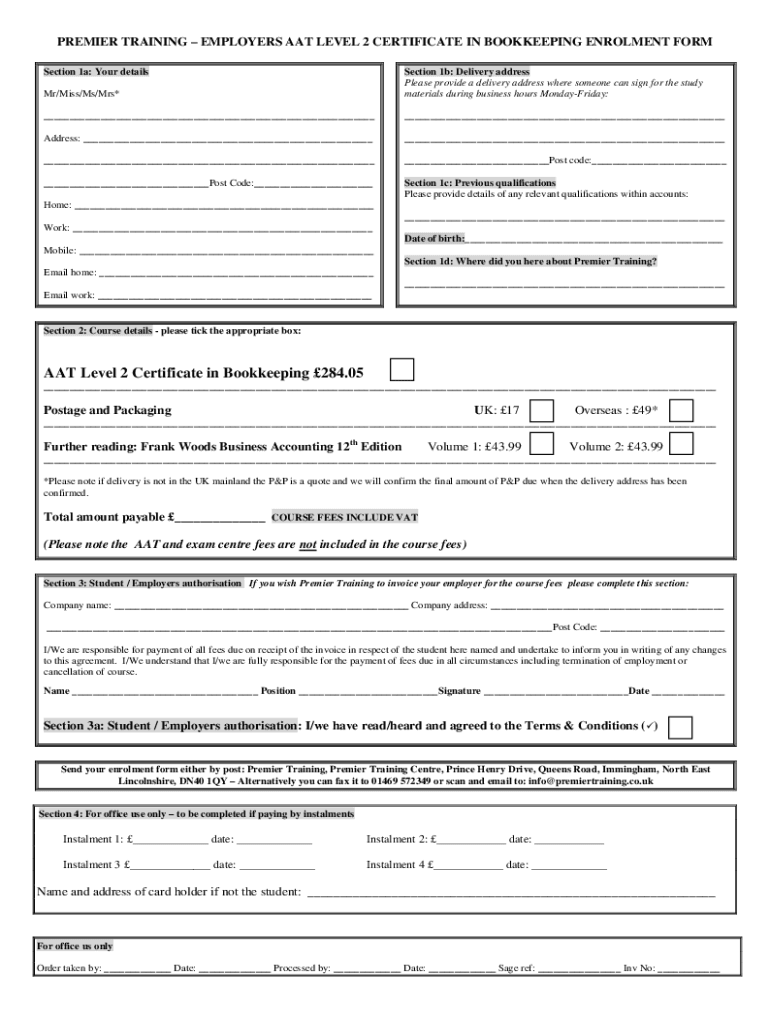PREMIER TRAINING EMPLOYERS AAT LEVEL 2 CERTIFICATE IN BOOKKEEPING Enrollment FORM Section 1a: Your details Mr/Miss/Ms/Mrs×Section 1b: Delivery address Please provide a delivery address where someone