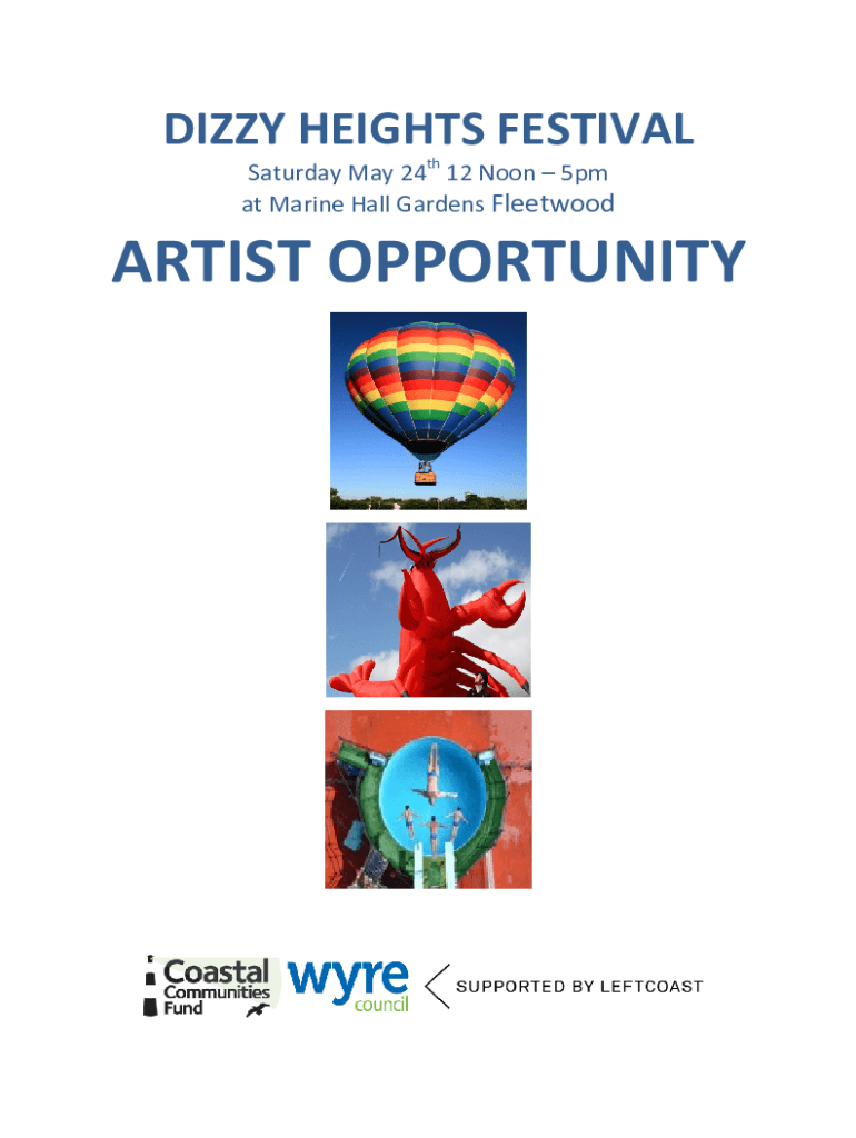 DIZZY HEIGHTS FESTIVAL Saturday, May 24th 12 Noon 5pm at Marine Hall Gardens FleetwoodARTIST OPPORTUNITYIntroduction and Background A skate park, splash zone and inclusive play area are among the