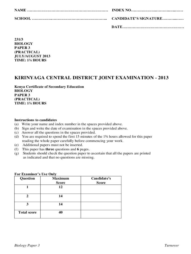 NAME INDEX NO......SCHOOL.CANDIDATES SIGNATURE. DATE231/3 BIOLOGY PAPER 3 (PRACTICAL) JULY/AUGUST 2013 TIME: 1 HOURSKIRINYAGA CENTRAL DISTRICT JOINT EXAMINATION 2013 Kenya Certificate of Secondary