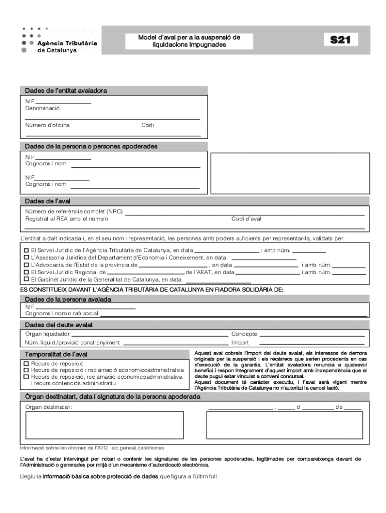 Aquest document serveix com a model d’aval per a garantir la suspensió de liquidacions impugnades davant l’Agència Tributària de Catalunya. Inclou dades de l’entitat avaladora, de les persones