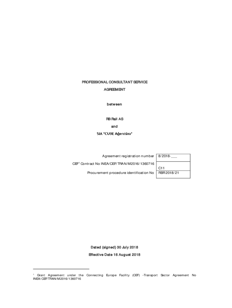 PROFESSIONAL CONSULTANT SERVICE AGREEMENTbetweenRB Rail AS agreement registration number8/2018___CEF1 Contract No IDEA/CEF/TRAN/M2016/1360716 Procurement procedure identification NoC11 RBR 2018/21Dated