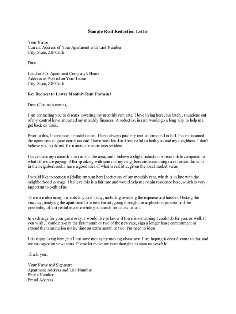 Sample Rent Reduction Letter Your Name Current Address of Your Apartment with Unit Number City, State, ZIP Code Date Landlord Or Apartment Company\'s Name Address as Printed on Your Lease City, State,