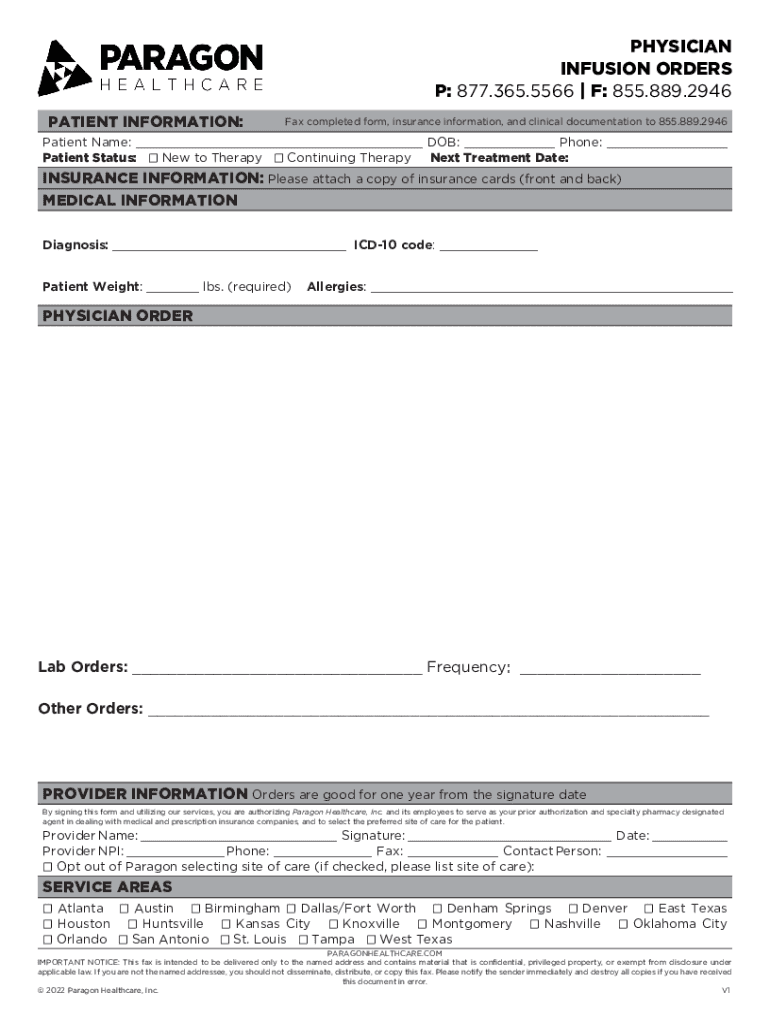 PHYSICIAN INFUSION ORDERS P: 877.365.5566 | F: 855.889.2946 PATIENT INFORMATION:Fax completed form, insurance information, and clinical documentation to 855.889.2946Patient Name: ___ DOB: ___ Phone: