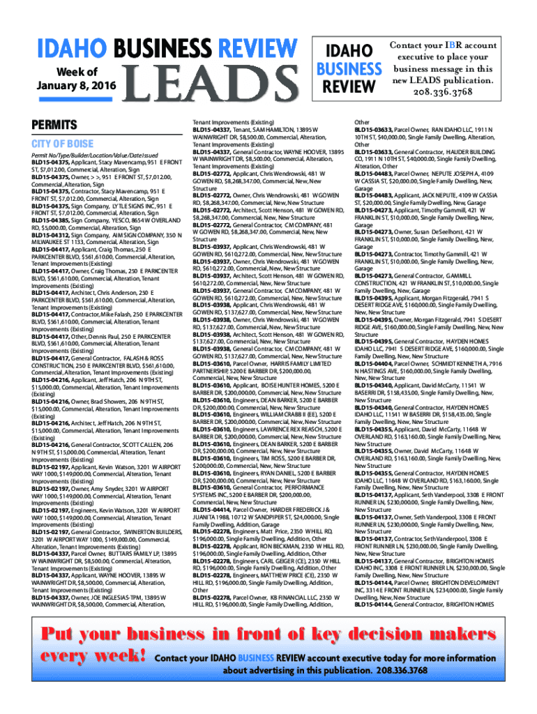 ID IDAHO AHO BUSINESS REVIEW Week of January 8, 2016PERMITS PERMITSLEADSCITY OF BOISE Permit No/Type/Builder/Location/Value/Date Issued CITY OF BOISEBLD1500780, Roofing/Siding/Wind, HOBSON FABRICATING