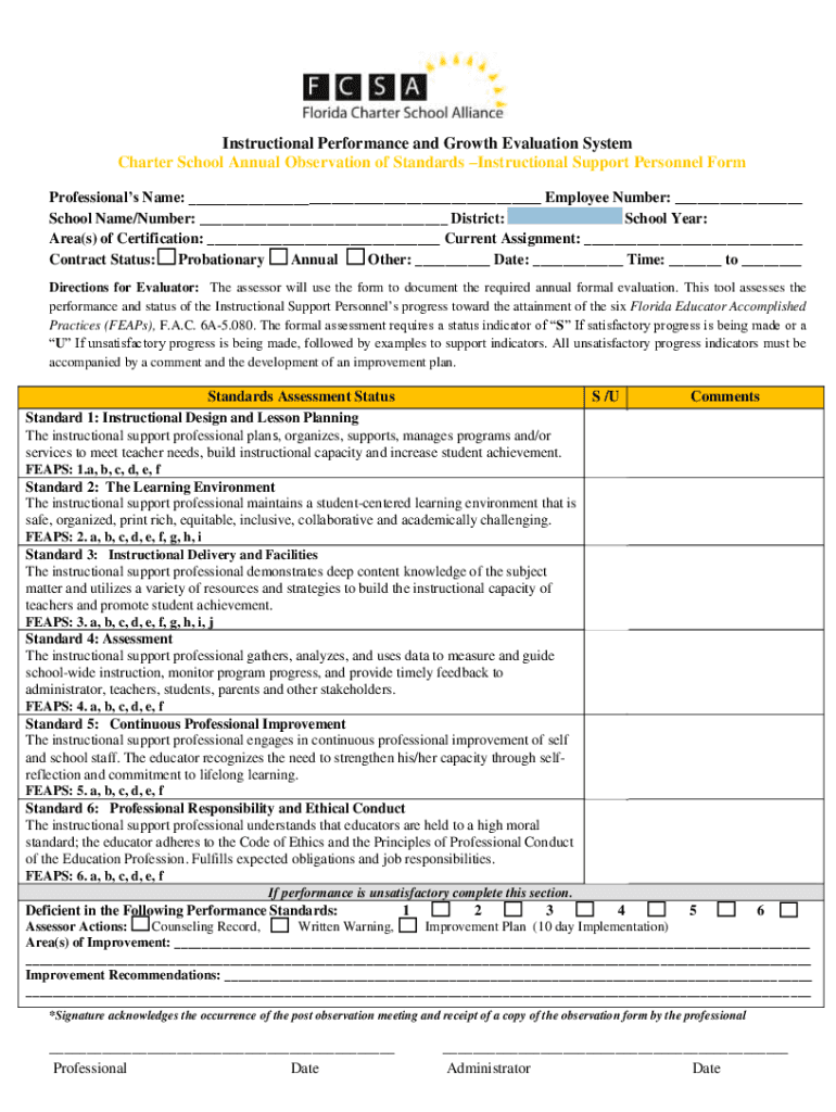Instructional Performance and Growth Evaluation System Charter School Annual Observation of Standards Instructional Support Personnel Form Professionals Name: ___ Employee Number: ___ School Name/Number: