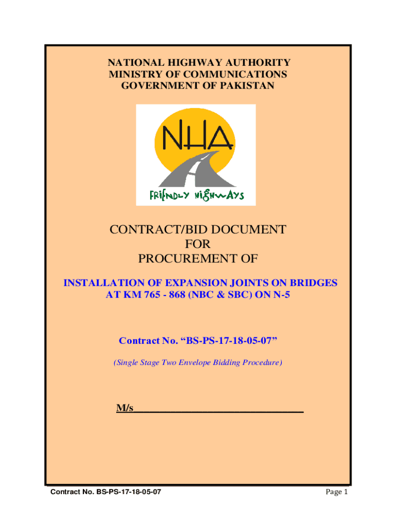 NATIONAL HIGHWAY AUTHORITY MINISTRY OF COMMUNICATIONS GOVERNMENT OF PAKISTANCONTRACT/BID DOCUMENT FOR PROCUREMENT OF INSTALLATION OF EXPANSION JOINTS ON BRIDGES AT KM 765 868 (NBC & SBC) ON N5Contract