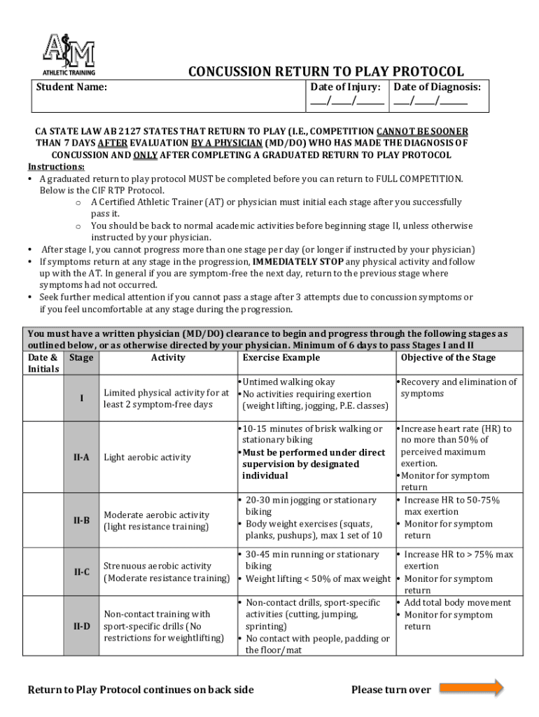 CONCUSSION RETURN TO PLAY PROTOCOLStudent Name:Date of Injury:Date of Diagnosis:___/___/______/___/___CA STATE LAW AB 2127 STATES THAT RETURN TO PLAY (I.E., COMPETITION CANNOT BE SOONERTHAN 7 DAYS