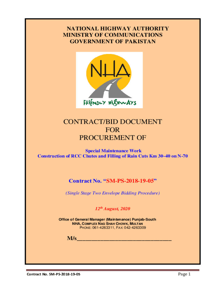 NATIONAL HIGHWAY AUTHORITY MINISTRY OF COMMUNICATIONS GOVERNMENT OF PAKISTANCONTRACT/BID DOCUMENT FOR PROCUREMENT OF Special Maintenance Work Construction of RCC Chutes and Filling of Rain Cuts Km