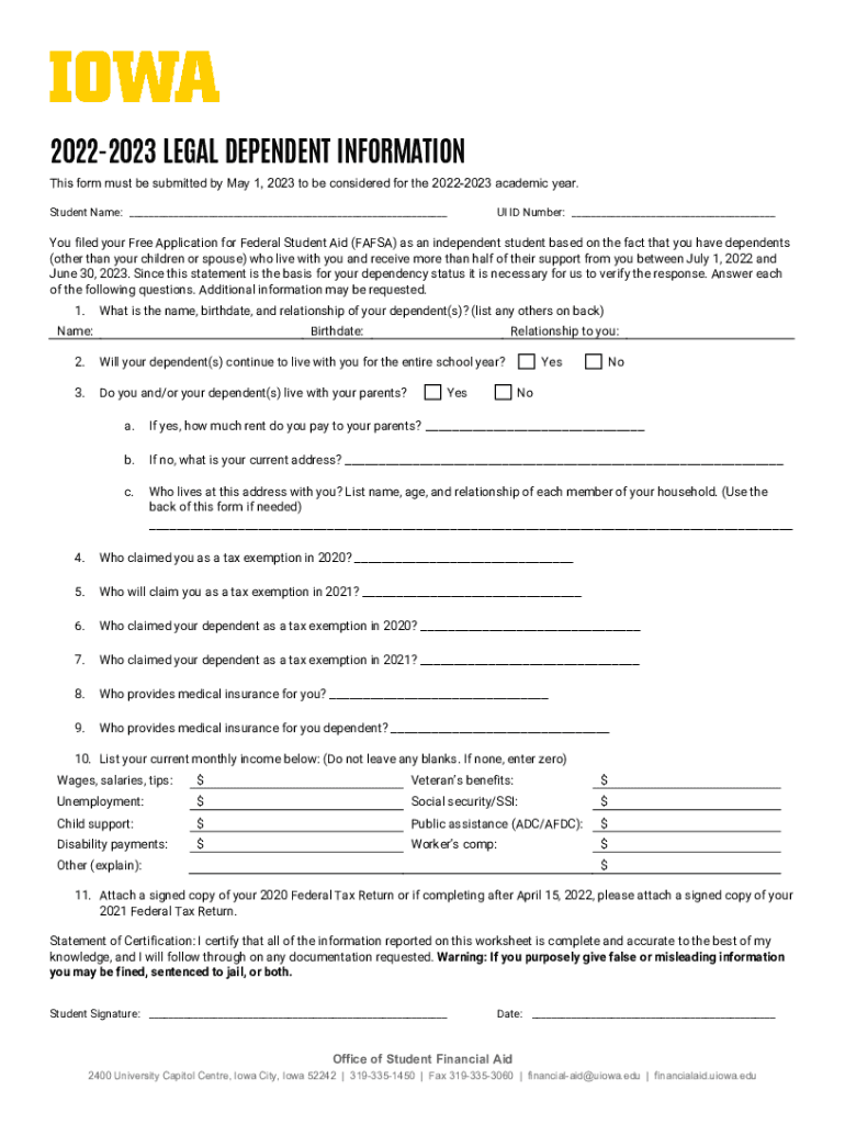 20222023 LEGAL DEPENDENT INFORMATION This form must be submitted by May 1, 2023, to be considered for the 20222023 academic year. Student Name: ___UI ID Number: ___You filed your Free Application