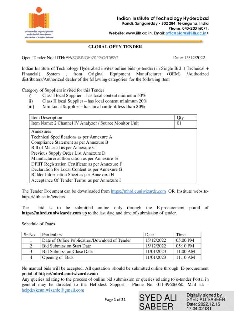 Website: www.iith.ac.in, Email: office.stores@iith.ac.inGLOBAL OPEN TENDER No: WITH/EE/SINGH/2022/O/T052GDate: