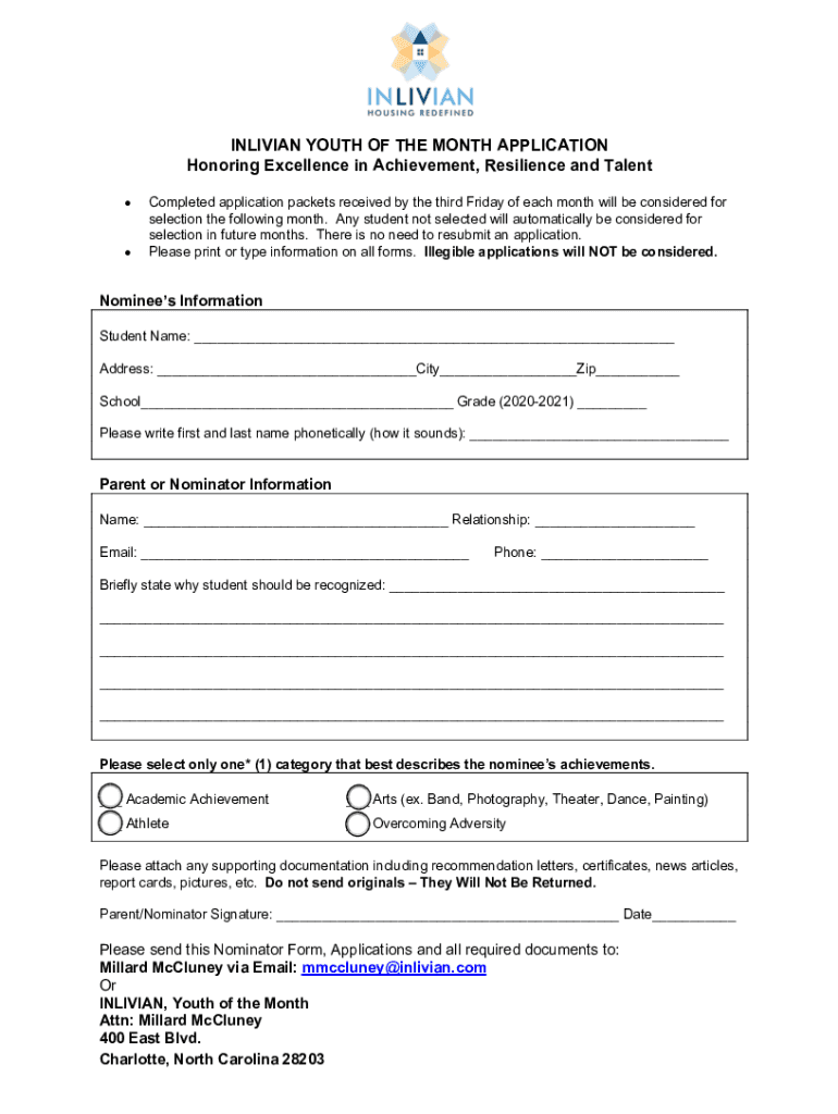 BOLIVIAN YOUTH OF THE MONTH APPLICATION Honoring Excellence in Achievement, Resilience and Talent Completed application packets received by the third Friday of each month will be considered for selection