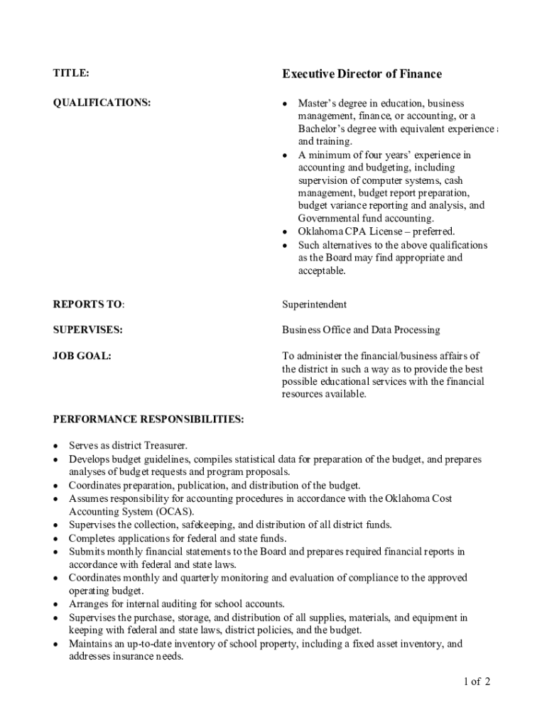 TITLE:Executive Director of FinanceQUALIFICATIONS: Master’s degree in education, business management, finance, or accounting, or a Bachelors degree with equivalent experience a and training. A minimum