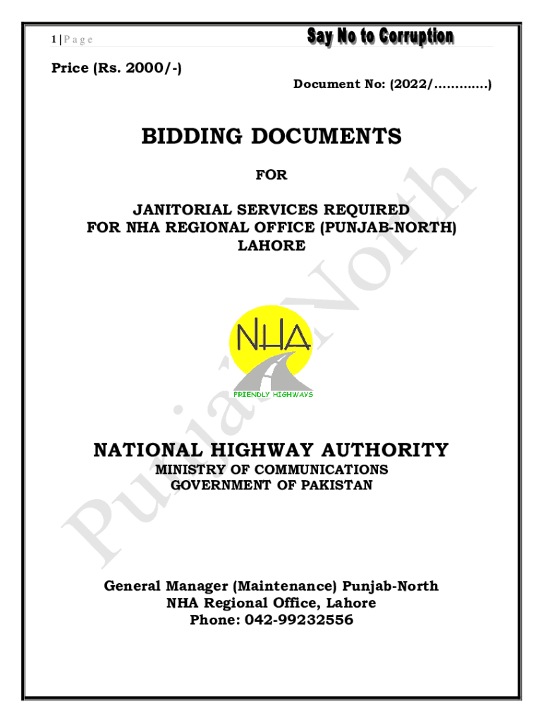 1|Page Price (Rs. 2000/) Document No: (2022/.)BIDDING DOCUMENTS JANITORIAL SERVICES REQUIRED FOR NHA REGIONAL OFFICE (PUNJABNORTH) LAHORENATIONAL HIGHWAY AUTHORITY MINISTRY OF COMMUNICATIONS GOVERNMENT