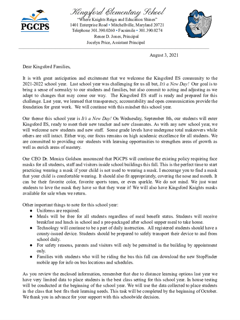 KingsfordElementarySchool WhereKnightsReignandEducationShines 1401EnterpriseRoad Mitchellville,Maryland20721 Telephone301.390.0260 Facsimile 301.390.0274 Renewed. Jones, Principal Jocelyn Price, AssistantPrincipal