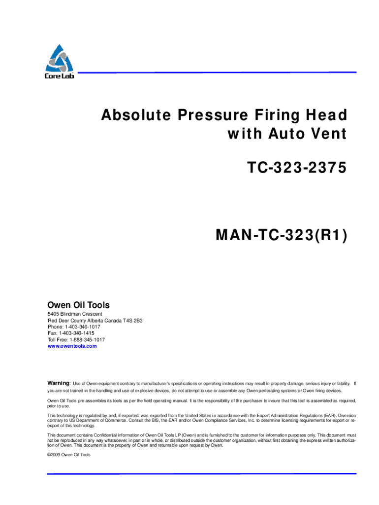 Absolute Pressure Firing Head with Auto Vent TC3232375MANTC323(R1)Owen Oil Tools 5405 Blind man Crescent Red Deer County Alberta Canada T4S 2B3 Phone: 14033401017 Fax: 14033401415 Toll Free: 18883451017