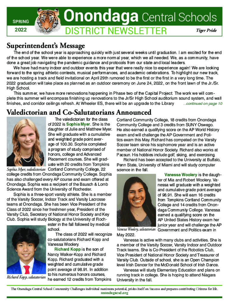 DISTRICT NEWSLETTERTiger PrideSuperintendents Message end of the school year is approaching quickly with just several weeks until graduation. I am excited for the