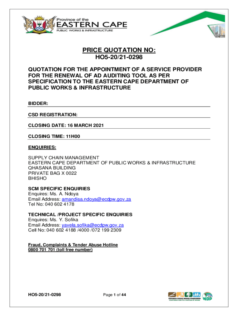 PRICE QUOTATION NO: HO520/210298 QUOTATION FOR THE APPOINTMENT OF A SERVICE PROVIDER FOR THE RENEWAL OF AD AUDITING TOOL AS PER SPECIFICATION TO THE EASTERN CAPE DEPARTMENT OF PUBLIC WORKS & INFRASTRUCTURE