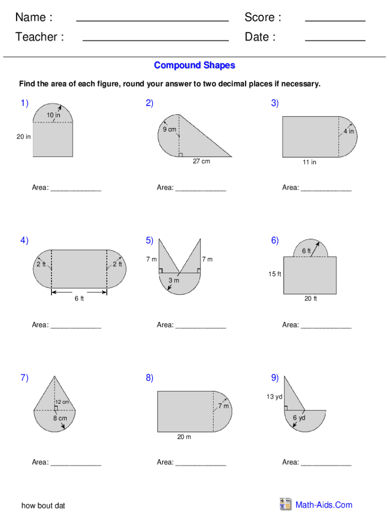 Name :Score :Teacher :Date : Compound ShapesFind the area of each figure, round your answer to two decimal places if necessary.1)2)3)10 in 9 cm4 in20 in27 area: ___11 area: ___4)5)Area: ___6) 6 ft2