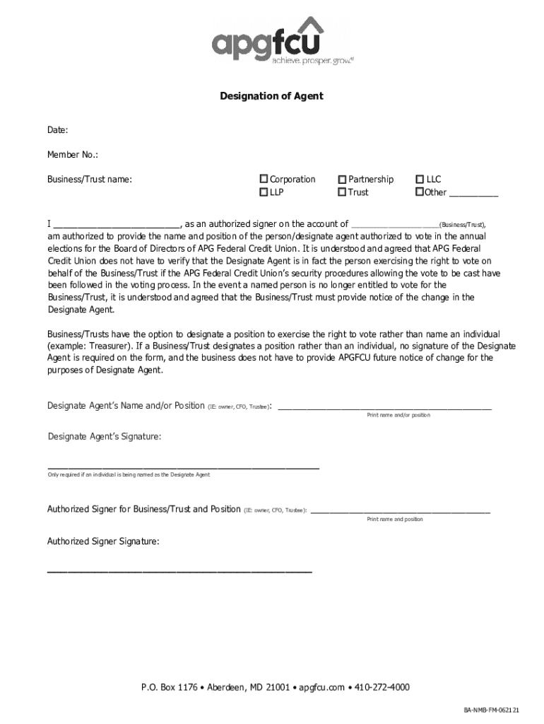 Designation of Agent Date: Member No.: Corporation Business/Trust name:Partnership Trust LLC Other ___I ___, as an authorized signer on the account of ___(Business/Trust), am authorized to provide