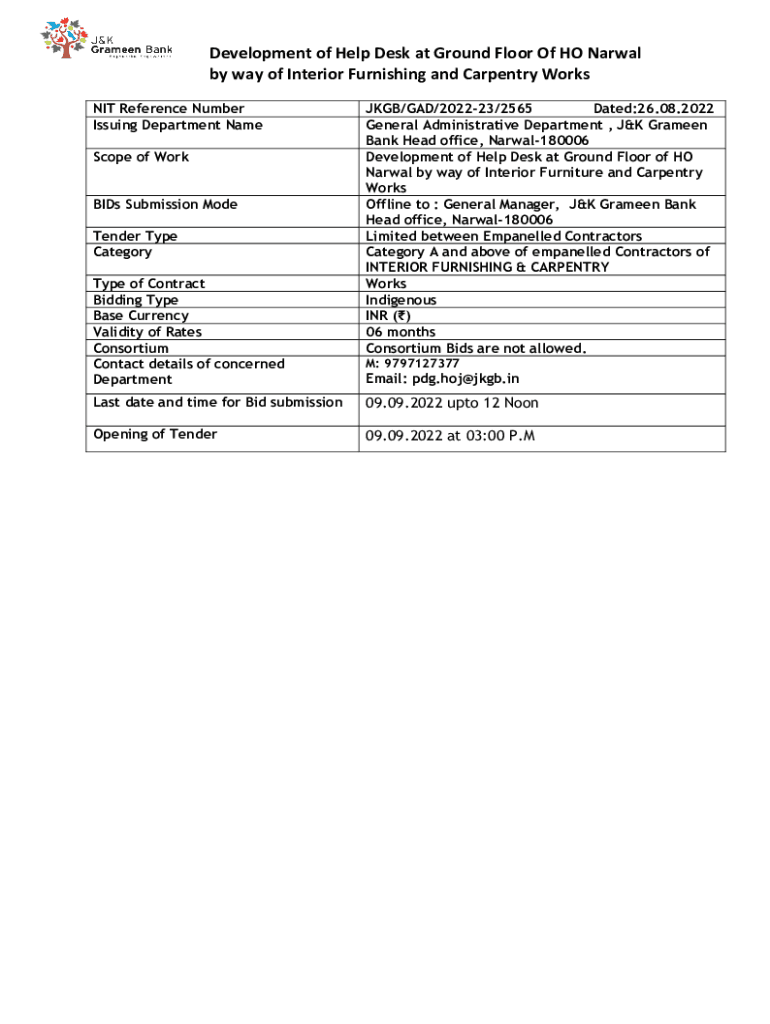 Development of Help Desk at First Floor Of HO Narwhal by way of Interior Furnishing and Carpentry Works NIT Reference Number Issuing Department Name Scope of Work BID's Submission Mode Tender Type