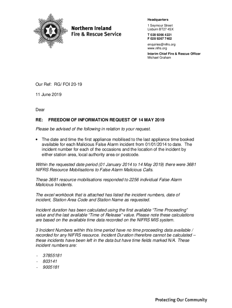 Headquarters 1 Seymour Street Lisbon BT27 4SX T 028 9266 4221 F 028 9267 7402 enquiries@nifrs.org www.nifrs.org Interim Chief Fire & Rescue Officer Michael Graham Ref: KG/ FOR 2019 11 June 2019Dear