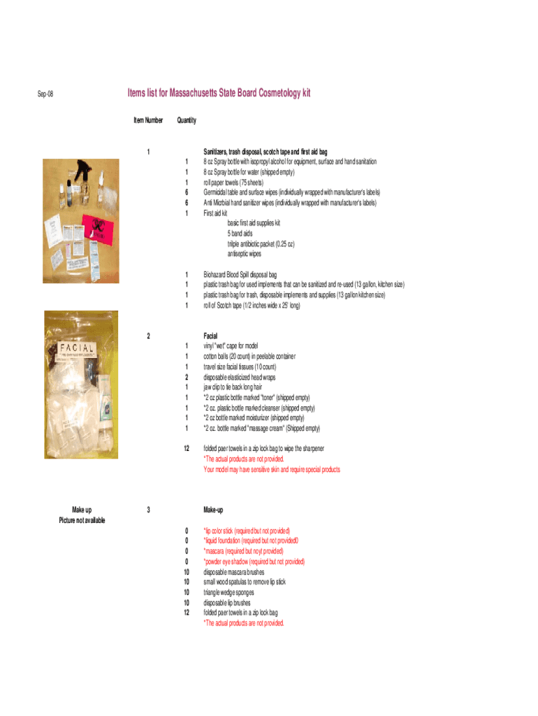 Items list for Massachusetts State Board Cosmetology kitSep08Item NumberQuantity1 1 1 1 6 6 11 1 1 1Biohazard Blood Spill disposal bag plastic trash bag for used implements that can be sanitized and