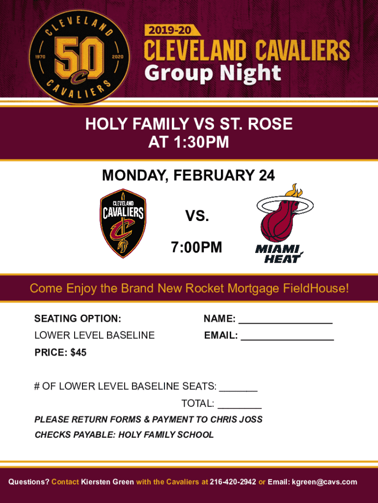HOLY FAMILY VS ST. ROSE AT 1:30PM MONDAY, FEBRUARY 24 VS. 7:00PM Come Enjoy the Brand New Rocket Mortgage Field House! SEATING OPTION:NAME: ___LOWER LEVEL BASELINEEMAIL: ___PRICE: $45# OF LOWER LEVEL