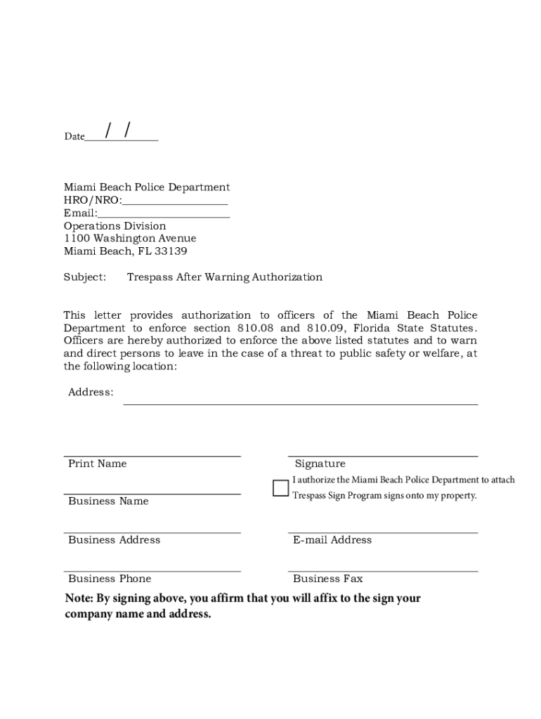 Trespass Sign Program/ /Date___Miami Beach Police Department PRO/NRO:___ Email:___ Operations Division 1100 Washington Avenue Miami Beach, FL 33139 Subject:Trespass After Warning Authorizations letter