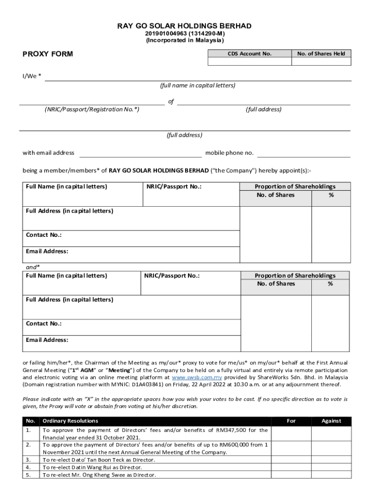 RAY GO SOLAR HOLDINGS BROAD 201901004963 (1314290M) (Incorporated in Malaysia)PROXY FORM CDS Account No. No. of Shares Held/We * (full name in capital letters) of (ERIC/Passport/Registration No.*)(full