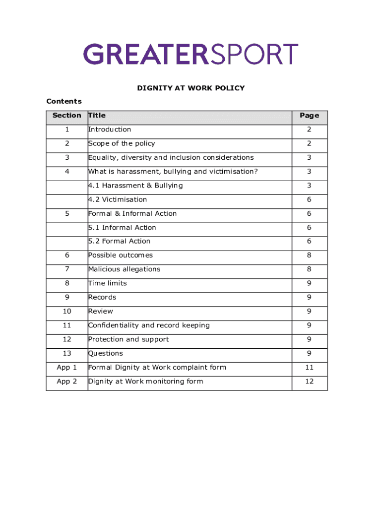 DIGNITY AT WORK POLICY Contents Section TitlePage1Introduction22Scope of the policy23Equality, diversity and inclusion considerations34What is harassment, bullying and victimization?34.1 Harassment