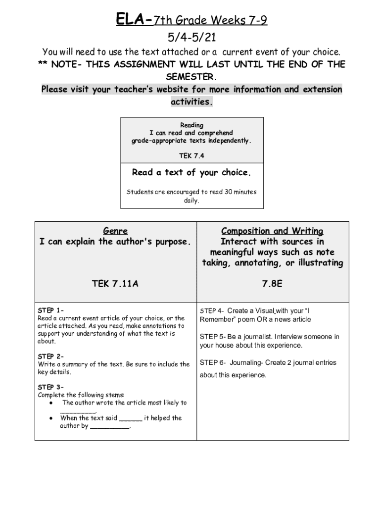 ELA7th Grade Weeks 79 5/45/21 You will need to use the text attached or a current event of your choice. ** NOTE THIS ASSIGNMENT WILL LAST UNTIL THE END OF THE SEMESTER. Please visit your teachers