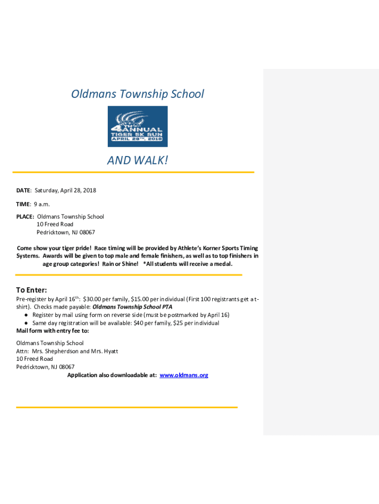 Old mans Township School AND WALK! DATE: Saturday, April 28, 2018, TIME: 9 a.m. PLACE: Old mans Township School 10 Freed Road Pedricktown, NJ 08067 Come show your tiger pride! Race timing will be
