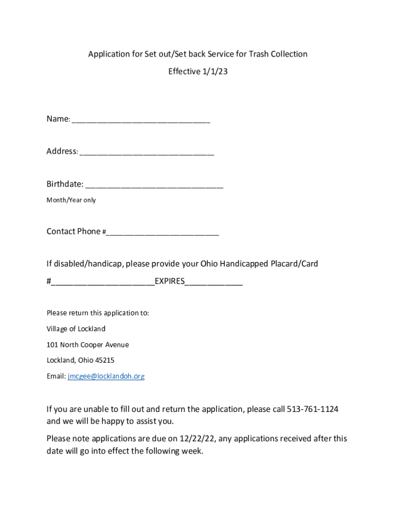 Application for Set out/Set back Service for Trash Collection Effective 1/1/23Name: ___ Address: ___ Birthdate: ___ Month/Year non-contact Phone #___ If disabled/handicap, please provide your Ohio