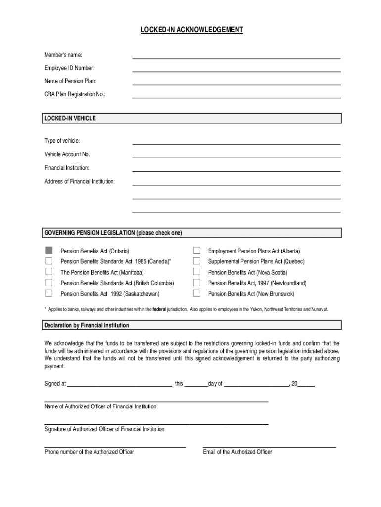 LOCKED IN ACKNOWLEDGEMENT Member\'s name: Employee ID Number: Name of Pension Plan: CRA Plan Registration No.: LOCKED IN VEHICLE Type of vehicle: Vehicle Account No.: Financial Institution: Address