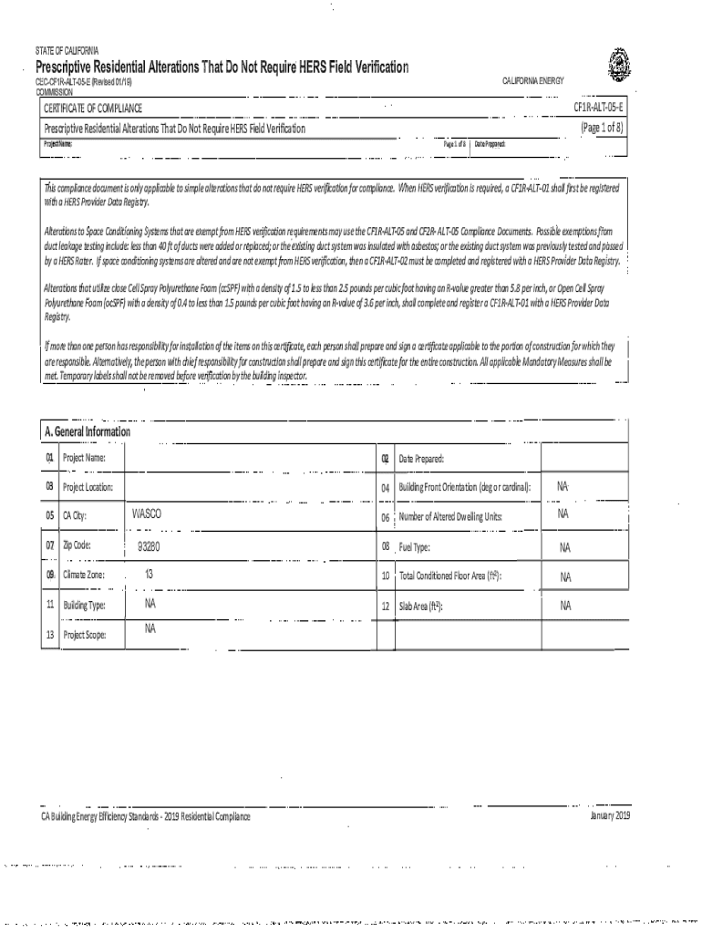 STATE OF CALIFORNIAPrescriptive Residential Alterations That Do Not Require HERS Field VerificationCALIFORNIA ENERGYCECCF1RALT05E (Revised 01/19)