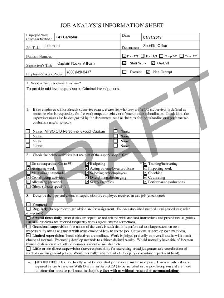 JOB ANALYSIS INFORMATION SHEET Employee Name (if reclassification):Job Title:Date:Rex CampbellLieutenantDepartment: Position Number: Supervisor\'s TitleCaptain Rocky Milliampere F/Sheriff\'s Office