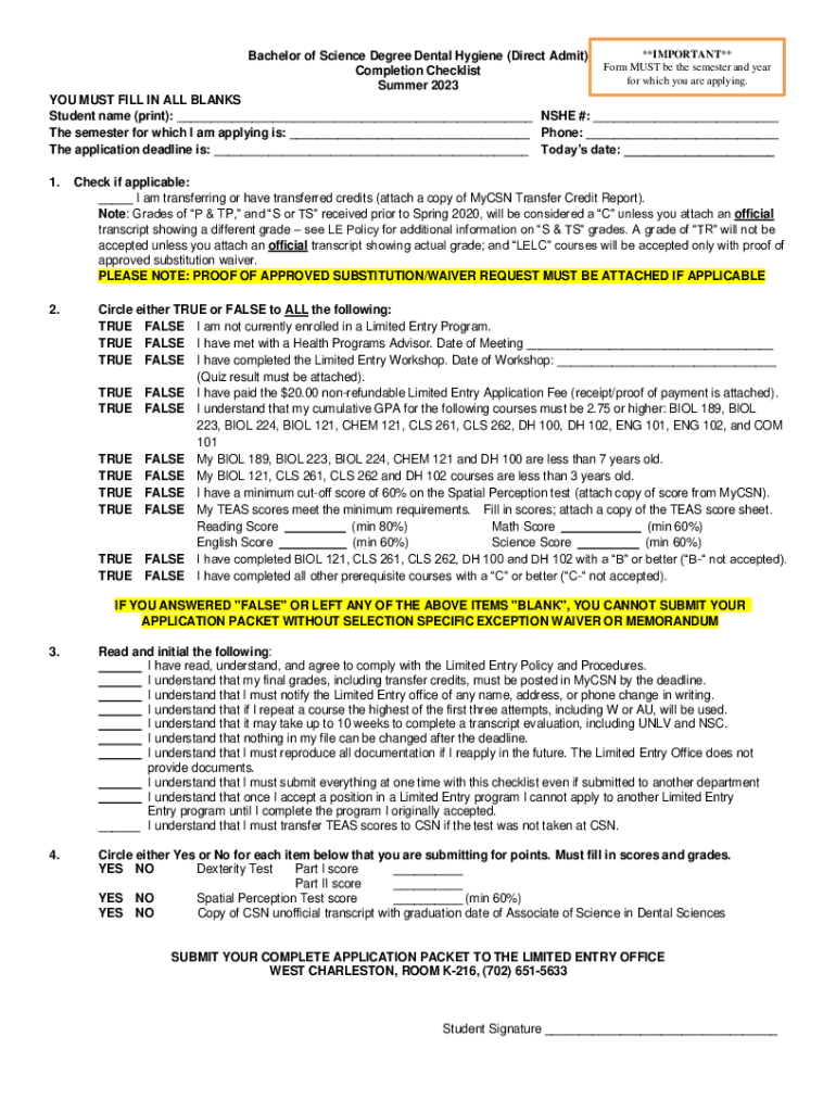 Bachelor of Science Degree Dental Hygiene (Direct Admit) Completion Checklist Summer 2023**IMPORTANT** Form MUST be the semester and year for which you are applying. YOU MUST FILL IN ALL BLANKS Student