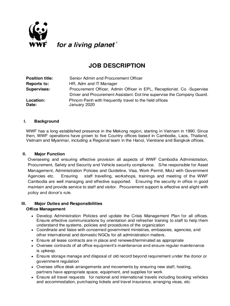 JOB DESCRIPTION Position title: Reports to: Supervises: Location: Date:I. Senior Admin and Procurement Officer HR, Adm and IT Manager Procurement Officer, Admin Officer in EPL, Receptionist. Co Supervise